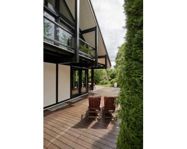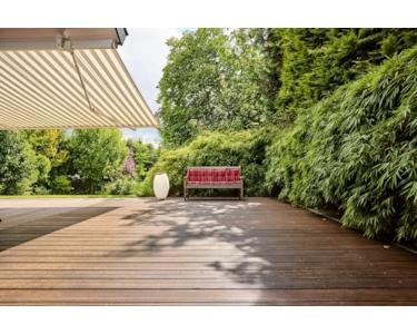 Alles stilvoll und elegant. Der großzügige Wohnbereich hat einen Kamin vor der Glasfront, so hat man Alles im Blick. Neben einer offenen Küche findet man noch ein Gäste-WC und ein Zusatzzimmer im EG. Das EG geht über auf eine teilweise überdachte Bankirai-Terrasse von ca. 130 qm, welche den Wohnbereich nach draussen erweitert. Hier gibt es jederzeit einen Bereich in der Sonne sowie einen Bereich im Schatten.