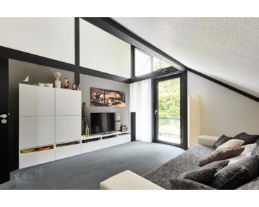 Wir bieten Ihnen ein modernes Fachwerkhaus mit schwarzem Fachwerk und Ausfachungen in Glas bzw weissem Dämmputz.
