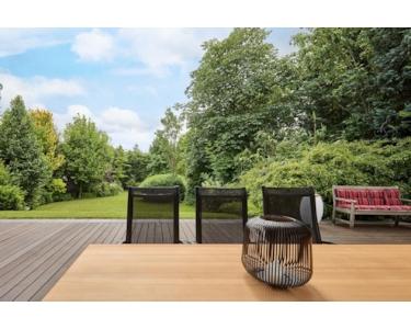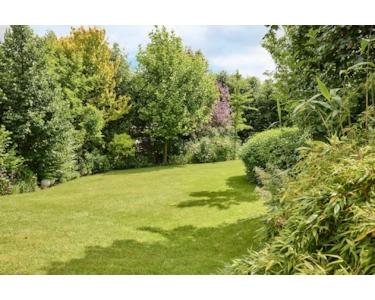 Das Grundstück umfasst 1845 QM und hat eine leichte Hanglage. Der nach Süden ausgerichtete Garten ist parkähnlich gestaltet, pflegeleicht und uneinsehbar. Neben der großen Holzterrasse gibt es ein kleines verstecktes Rondell für den Nachmittagskaffee.