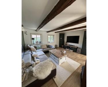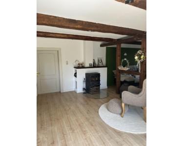 An der Giebelseite Richtung Westen liegt das große, gemütliche Wohnzimmer mit Ofen.