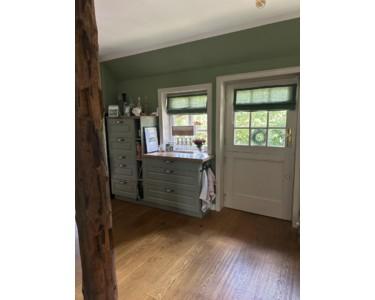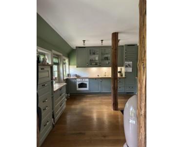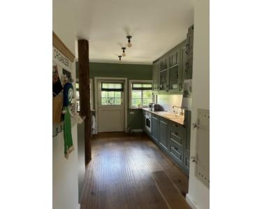 Die lindgrüne Landhauseinbauküche wurde 2018 neu eingebaut und bietet sehr viel Stauraum.