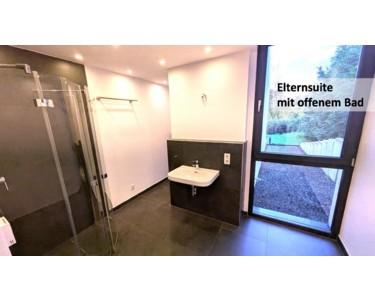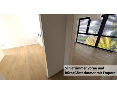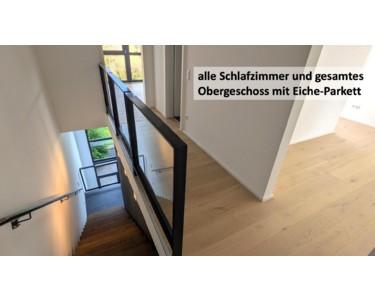 - hochwertige, großformatige Feinsteinzeug-Bodenbeläge, Eiche-Parkett in allen Schlafzimmern und im Obergeschoss