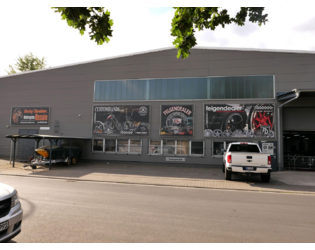 Showroom 1 & Bürofläche / Kundenempfang / Steinboden, Fließen, Deckenbeleuchtung LED, EDV Verkabelung, Toilette, Abstellraum, kleiner Arbeitsraum, große Sektionstore, Eingangstüren und Nebentüren in Stahl, großes Doppel-Metalltor, Fenster Tageslicht - vergittert, Kundenparkplätze direkt vor dem Eingangsbereich und zahlreiche weitere im Hof.