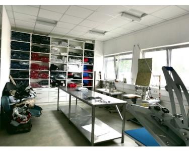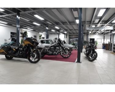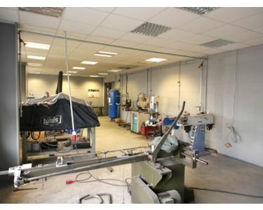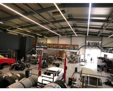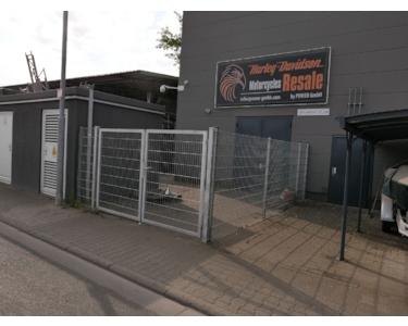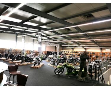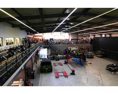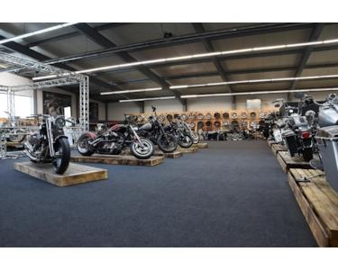Lagerbereich mit Schwerlastregal, offene Werkstattfläche, abgeteilte Motorradwerkstatt mit Sektionstor zur Halle, Lackierkabine, Raum für Pulverbeschichtung, Schweißraum, Küche Mitarbeiter, Umkleide Mitarbeiter, Toilettenanlage Mitarbeiter, sep. WC-Raum, Zugang zum Bürobereich im Obergeschoß mit Treppenaufgang, sep. Treppenaufgang zur 2. Ebenen, sep. Treppenaufgang zur Galerie und einem Kompressor- Raum, großes Hallen-Sektionstor,
