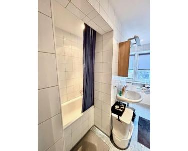 Das Bad hat große Fenster und eine Wanne. Die Waschmaschine und der Trockner stehen im Flur, was sehr praktisch ist, weil es Platz spart.