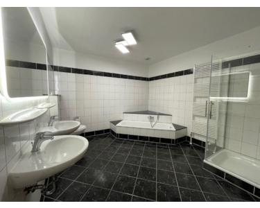 ein modernes, großes Badezimmer mit Badewanne, Dusche und zwei Waschbecken