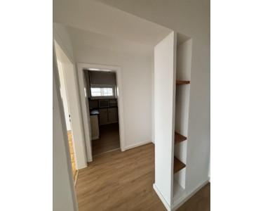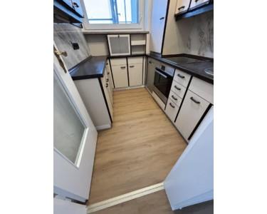 Wohn- und Schlafzimmer verfügen über Parkettböden. Küche und der Bereich des Eingangs sind mit Vinyl ausgelegt. Das Badezimmer ist bis zur Decke gefliest. Die Küche ist ausgestattet mit einen Herd mit Ceranfeld, Kühlschrank und Geschirrspüler.