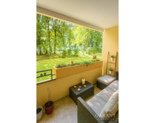 Das großzügige Wohnzimmer bietet Zugang zum überdachten Balkon mit Blick ins Grüne, ein idealer Platz zum Entspannen.