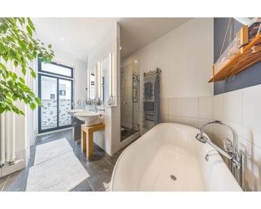 Die untere Ebene begeistert mit drei harmonisch geschnittenen Zimmern, die als Schlaf-, Kinder- oder Arbeitszimmer genutzt werden können. Originale Stuckelemente, klassische Flügeltüren und edler Fischgrätparkett verleihen den Räumen zeitlose Klasse. Das Hauptschlafzimmer ist klimatisiert, das ansprechende Tageslichtbad überzeugt mit einer individuellen Wanne, Walk-in-Dusche und Doppelwaschbecken. Ein Hauswirtschaftsraum sorgt für diskrete Funktionalität.