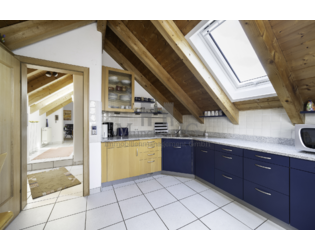 Im unteren Wohnbereich befindet sich der großzügige Wohnbereich mit Zugang zum überdachten Balkon, der nach Westen ausgerichtet ist und angenehme Sonnenstunden am Nachmittag ermöglichen. Die Küche ist separat gehalten und bietet nicht nur eine voll ausgestattete Einbauküche mit sämtlichen Elektrogeräten, sondern auch ausreichend Platz für einen Esstisch - ideal für gemütliche Familienmahlzeiten oder geselliges Beisammensitzen.
