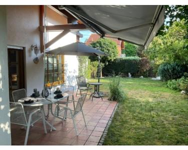 - großer heller Wohn-/Essbereich (ca. 50 m²) mit direktem Zugang zur überdachten Terrasse und dem Garten.