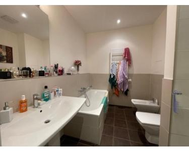 Das große Badezimmer ist mit Wanne, Dusche, Bidet und WC ausgestattet. Zusätzlich steht ein separates Gäste-WC zur Verfügung.
