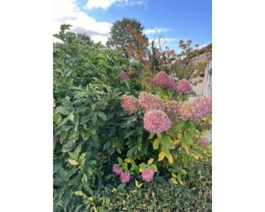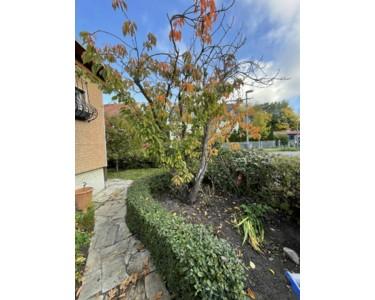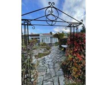 Im Garten gibt es eine Garage für ein Auto und einen Geräteschuppen.