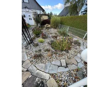 Neben schönen Blumenrabatten ist auch ein kleiner Teich mit Bachlauf angelegt.