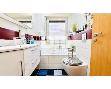 Das moderne Tageslichtbad mit Wanne überzeugt in zeitlosem Fliesendesign.