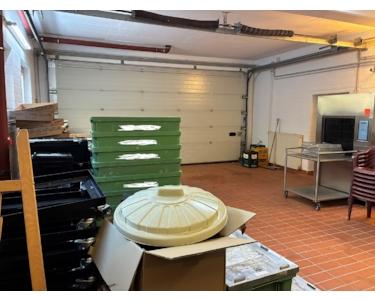 Halle ebenerdig gefliest ( ca. 59 qm), beheizt (Radiatoren), Hallenhöhe ca.2,8m Durchfahrthöhe sonst ca.3,2m mit Zugang vom Gebäude EG und Rolltor 5,6m breit x 2,8m hoch. Der Hallenvorplatz ist Glasüberdacht (siehe Bilder)