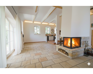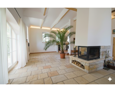 Die Wohnung erstreckt sich als Maisonette über zwei Etagen und überzeugt durch ihre besondere Architektur. Im Erdgeschoss öffnet sich der Wohnraum mit einer Deckenhöhe von über drei Metern zu einem großzügigen, loftartigen Ambiente. Mediterrane Terrakottafliesen, kombiniert mit rustikalen und modernen Elementen, schaffen eine warme und einladende Atmosphäre. Mittelpunkt ist der große Kamin, der von allen Bereichen des offenen Wohnraums aus sichtbar ist und für ein unvergleichliches Wohngefühl sorgt. Über eine elegante Rundbogen-Flügeltür gelangt man auf die Terrasse mit angrenzendem, privaten Garten. Durch die Lage auf einem Eckgrundstück bietet sich hier viel Freiraum und Privatsphäre – ein Platz, an dem sich sogar winterharte Palmen kultivieren lassen und mediterranisches Lebensgefühl aufkommt.