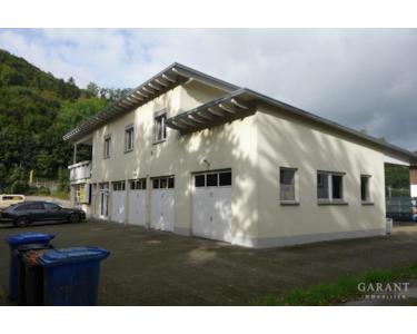 Erdgeschoss: vier Büroräume, Aufenthaltsraum, Teeküche, Gäste-WC, fünf Garagen, Werkstattraum mit Hebebühne, sechs Außenstellplätze, Waschplatz, Außengarage
