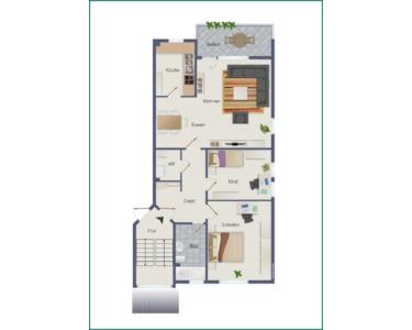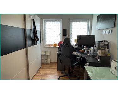 Die Wohnung verfügt eine normale und gepflegte Ausstattung mit Türen und Zargen aus Meranti-Furnier. Der Boden der Diele ist mit einem Laminat im Nussbaumdekor ausgelegt. Das modernisierte Badezimmer mit Fenster verfügt über einen schwarzen Fliesenboden, eine Badewanne mit Duschaufsatz sowie eine dreiviertel hohe weiße Wandverfliesung. Im Schlafzimmer mit viel Platz ist ein Laminat im modernen Eichdekor verlegt. Das gemütliche Kinderzimmer hat den gleichen Boden und zwei Fenster. Das große und gut zugeschnittene Wohn-Esszimmer verfügt ebenfalls über einen Laminatboden im Nussbaumdekor. Der schöne Balkon bietet einen hohen Freizeitwert. Die zum Teil Bodentiefen Fenster sorgen für eine natürliche und sehr gute Belichtung. Die Küche ist mit einem weißen Fliesenspiegel versehen und der Boden mit einer weißen Fliese ausgelegt. Die Einbauten gehören dem Mieter.