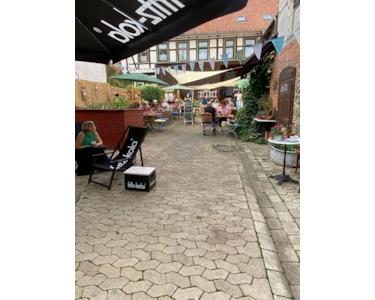 Für die Gäste steht weiterhin ein Freisitz mit 30 Plätzen vor dem Hotel und der niedliche Hinterhof mit ca. 40 Außenplätzen zur Verfügung. Der Hof kann als Hofcafe während der Sommermonate betrieben werden.