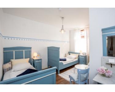 Im 2. OG befindet sich auch eine separate Wohnung mit großem Wohnzimmer, Schlafzimmer und Bad z.B. für die Wirtsleute sowie zwei kleine, private Gästezimmer oder Kinderzimmer.