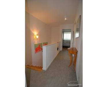 Eine elegante Echtholztreppe führt in das obere Geschoss, wo sich die Wohnbereiche harmonisch über zwei Ebenen verteilen. Das großzügige Badezimmer ist mit einer Badewanne, einer separaten Dusche sowie einem Doppelwaschbecken ausgestattet; zusätzlich steht ein Gäste-WC zur Verfügung. Eine praktische Kammer bietet zusätzlichen Stauraum.