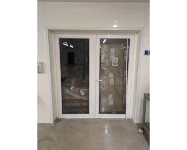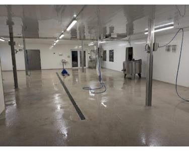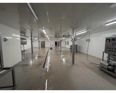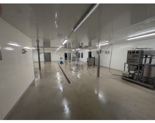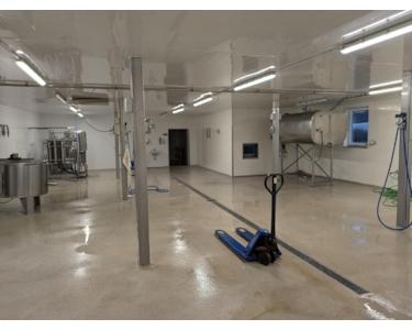 Der Produktionsraum ist mit Kunststoffpaneelen verkleidet und isoliert. Keine Fugen. Rutschfester, leicht zu reinigender Fußboden mit mittiger Ablaufrinne.