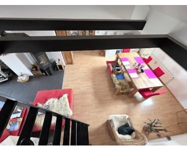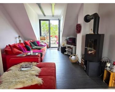 Raumaufteilung: offenes Wohnen/Essen/Küche; Lichtdurchflutet mit Empore in den Dachstuhl ausgebaut; Schlafzimmer, Kinderzimmer mit Empore und Schlafplatz im Giebel; sichtbare ausgebaute Dachbalken laden Kinder zum Schaukel ein, oder für ein Workout! - Terrasse: große 30m² an den Dachstuhl gebaut, freihängend, mit 2 Gauben Eingängen in die Wohnbereiche; Sonne und Schattenplätze garantiert.