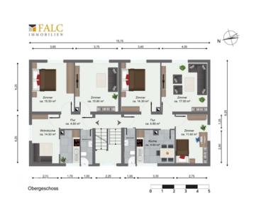 Das dreigeschossige Gebäude beherbergt insgesamt sechs Wohnungen, die sich gleichmäßig auf die Etagen verteilen. Auf jeder Ebene befinden sich zwei nahezu identisch geschnittene Einheiten, die mit funktionalen Grundrissen und hellem Wohnambiente überzeugen – ideal für Singles, Paare oder kleine Familien.