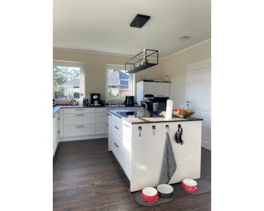 Die Einbauküche verläuft im rechten Winkel mit Unterschränken und zwei ¾-hohen Schrankelementen über die gesamte Süd- und Westwand. Ein große Kochinsel wurde in der Mitte des Raumes platziert.