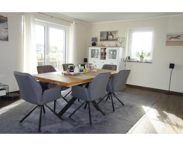 Der große Raum gliedert sich in zwei Bereiche. Im südöstlichen Teil des Raumes, nahe der Tür zur Küche haben sich die Eigentümer einen großzügigen Essbereich angelegt.