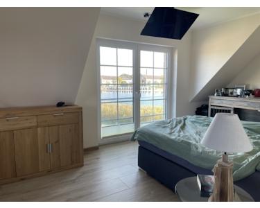 Im rechten, etwas schmaleren Teil, mittig in die Dachgaube mit den bodentiefen Fenstern gerückt, wurde das Bett genauso gestellt, dass man den herrlichen Blick aus dem Fenster genießen kann. Hier möchte man gar nicht mehr aufstehen!