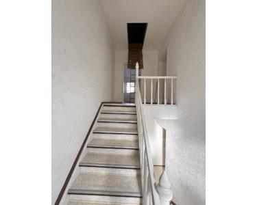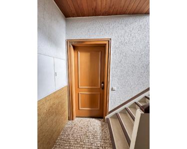 Über einen straßenseitig gelegenen Hauseingang gelangen Sie in das Treppenhaus mit Holztreppe ins Ober- und Dachgeschoss.