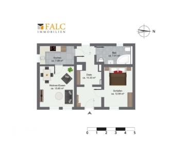 Auf einer Ebene verteilen sich zwei helle Zimmer, eine Wohnküche sowie ein Tageslichtbad mit Badewanne – ideal für Singles, Paare oder kleine Familien, die Ruhe und Freiraum suchen.
