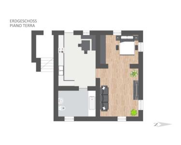 RAUMAUFTEILUNG ERDGESCHOSS: großzügige Wohnküche, 2x Elternschlafzimmer mit Terrasse und Kaminofen, Bad mit Fenster
