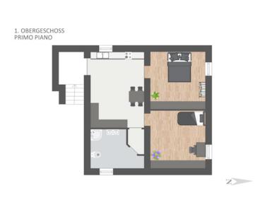 RAUMAUFTEILUNG 1. OBERGESCHOSS: großzügiger Eingangsbereich mit Wohnküche, 2x Elternschlafzimmer, Bad mit Fenster