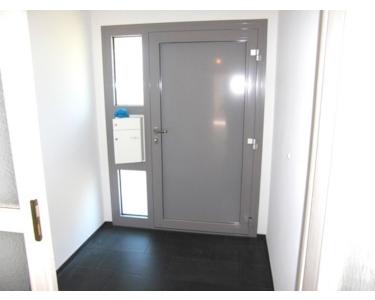 Der praktische Windfang ist mit den eleganten, pflegeleichten schwarzen Fliesen in Schieferoptik versehen und macht durch die neue, platingraue Haustür einen sehr schicken Eindruck.