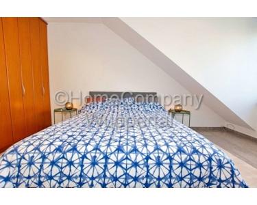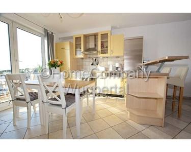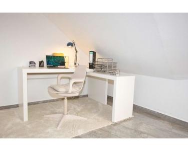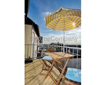 This generously proportioned apartment extends over 2 floors and has a modern tiled floor. The living room with integrated kitchen, a guest WC and the 2 balconies are located on the first floor. A staircase leads to the upper sleeping area with the bathroom. The living area is furnished with a large, gray sofa bed, a comfortable armchair, 2 side tables and a flat-screen TV with satellite connection. The integrated fitted kitchen leaves nothing to be desired: a ceramic hob with oven and extractor, a fridge-freezer, a dishwasher, all cooking utensils and crockery are provided here. There is a dining table for 4 people. From the dining area you enter the balcony with a very nice view, there is another balcony on the other side of the living room. Stairs lead up to the bedroom with a double bed, a large built-in wardrobe and another TV set. Several attic niches have been converted into storage rooms and offer enormous storage space. The daylight bathroom is equipped with a suspended WC, a bathtub with shower function and a vanity unit. A large corner desk for a home office completes the offer. Bed linen and towels are provided and there is a washing machine in the basement. The rent is € 900.00 for one person including all energy and ancillary costs and the use of the Internet.