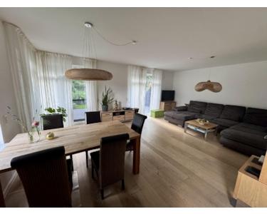 In diesem lichtdurchfluteten Haus empfängt Sie im Erdgeschoss ein großzügiger Wohn- und Essbereich mit bodentiefen Fenstern, hohen Decken und Zugängen zur sonnigen Süd- und Westterrasse sowie zum Garten. Die helle offene Einbauküche im modernen Design fügt sich harmonisch ein und lädt zum gemeinsamen Kochen ein.
