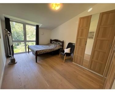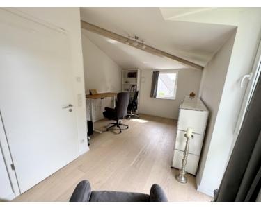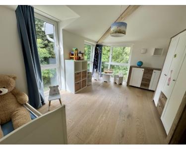 Im Obergeschoss liegen drei helle Schlafzimmer, sowie ein modernes Vollbad mit Wanne und Dusche. Die offenliegenden Dachgiebel sorgen für besonderen Charme.