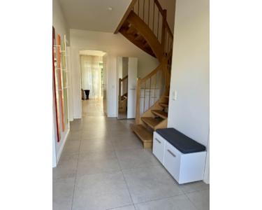 Die Inneneinheit der Wärmepumpe, die Gastherme sowie ein Warmwasserspeicher befinden sich im Keller mit separatem Zugang. Alle Zimmer verfügen über Fußbodenheizung, Eichenparkett oder großformatige, helle Fliesen.