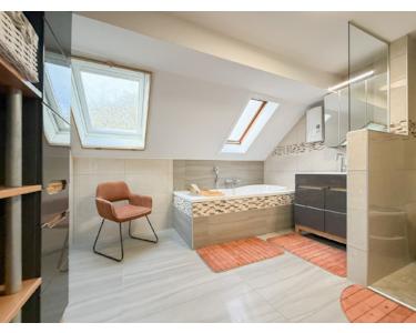 Das Dachgeschoss verfügt über zwei weitere Räume, ein schickes Vollbad und ein weiteres WC. Diese Ebene eignet sich ideal für den heranwachsenden Jugendlichen, der das „Hotel Mama“ noch nicht verlassen möchte.