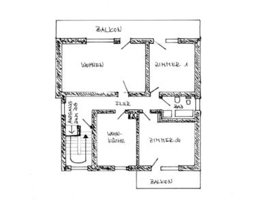 In der ersten Etage (ca 100 qm) der Wohnung (das entspricht der zweiten Etage des Hauses) befinden sich die Wohnküche, ein Bad mit Wanne und Dusche und 3 Zimmer. In diesem Stockwerk gibt es 2 Balkone, einen großen über die ganze Länge des Hauses und einen kleinen zur Rückseite.