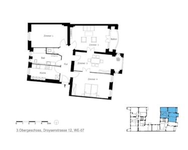 Der historische Altbau in der Droysenstraße 12, erbaut im Jahr 1910, verbindet klassischen Charme mit modernen Annehmlichkeiten. Das Foyer, geschmückt mit kunstvollen Stuckelementen, edlem Bodenbelag und Wänden aus Naturstein, schafft eine einladende Atmosphäre. Das Gemeinschaftseigentum wird aktuell umfassend aufgewertet, unter anderem durch die Erneuerung der Fassade, die Renovierung des Treppenhauses sowie Sprech- und Klingelanlagen. Der idyllische Innenhof mit Fahrradstellplätzen, Grünflächen und Sitzgelegenheiten bietet den Bewohnern und Gästen einen ruhigen Rückzugsort mitten in der Stadt.