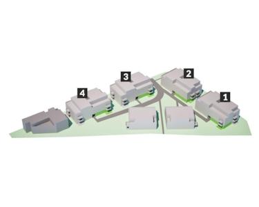 Haus 1 bis 4 sind nahezu identisch aufgebaut und verfügen jeweils über 14 Wohneinheiten mit Wohnflächen von ca. 84 m² - ca. 132 m² und 3 bzw. 4 Zimmer.