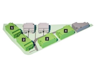 Die 6 Mehrfamilienhäuser und ihre dazugehörigen Zuwegungen sind so angeordnet, dass im Innenhof - geschützt und von der Straße abgewandt - großzügig dimensionierte Grünflächen und für die kleinsten Bewohner ein gut einsehbarer Spielplatz entstehen.