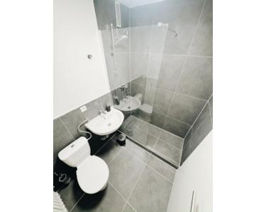 Das Bad verfügt über eine begehbare Dusche mit Glaswand, ein WC und einen
