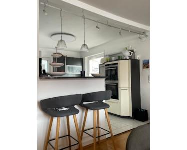 Wohnung im 1. Obergeschoss (156 m²): Diese elegante Wohnung erstreckt sich über zwei Etagen und umfasst insgesamt 156 m² Wohnfläche. Das Highlight ist die moderne Einbauküche, die in den offenen Essbereich integriert ist – der ideale Ort für Familien, um gemeinsam zu kochen, zu essen und zu plaudern. Von der Küche gelangt man direkt auf einen der beiden Balkone im 1. OG. Das Wohnzimmer mit Balkonzugang lädt zum Entspannen ein, mit einem wunderschönen Ausblick in die Umgebung. Ein weiteres Zimmer, aktuell als Büro genutzt, bietet ebenfalls Zugang zum Balkon.