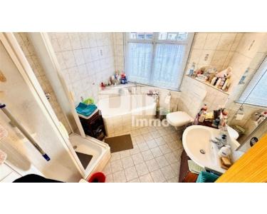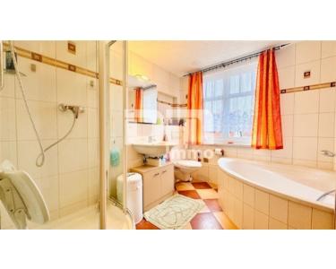 Das moderne Tageslichtbad in ansprechendem zeitlosen Fliesendesign ist mit Dusche und Eckwanne ausgestattet.