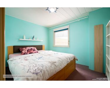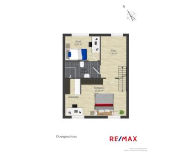Im Obergeschoss führt ein zentraler Flur ins Schlafzimmer mit praktischem Ankleidebereich. Das Badezimmer mit Dusche dient hier als Durchgangszimmer zum Kinderzimmer, was eine praktische Nutzung für kleine Familien ermöglicht. Zusätzlich eröffnet der Zugang zum ungenutzten Dachgeschoss die Möglichkeit für weiteren Wohn- oder Stauraum.
